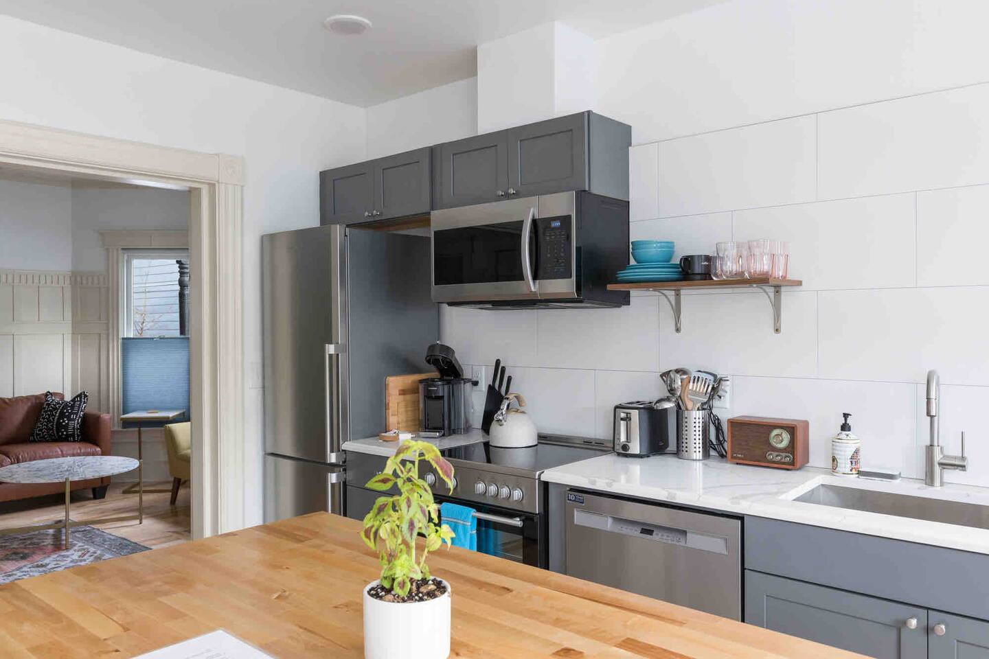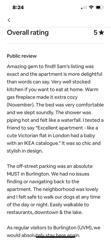 Small one bedroom apartment on the first floor with automatic check in. One parking spot, full kitchen. All newly renovated space right downtown on North street. Guests enjoy being walkable to downtown and all Burlington has to offer.